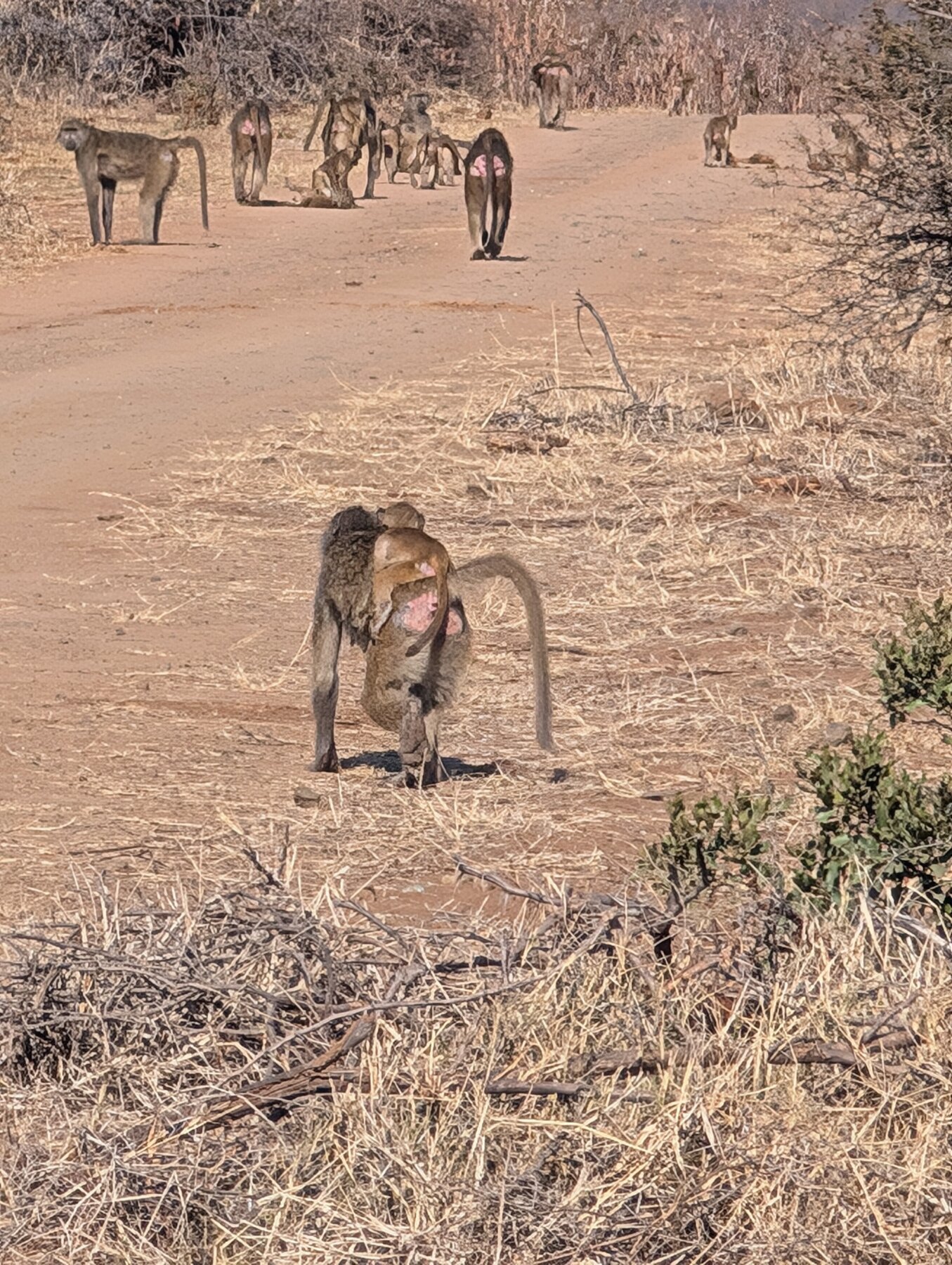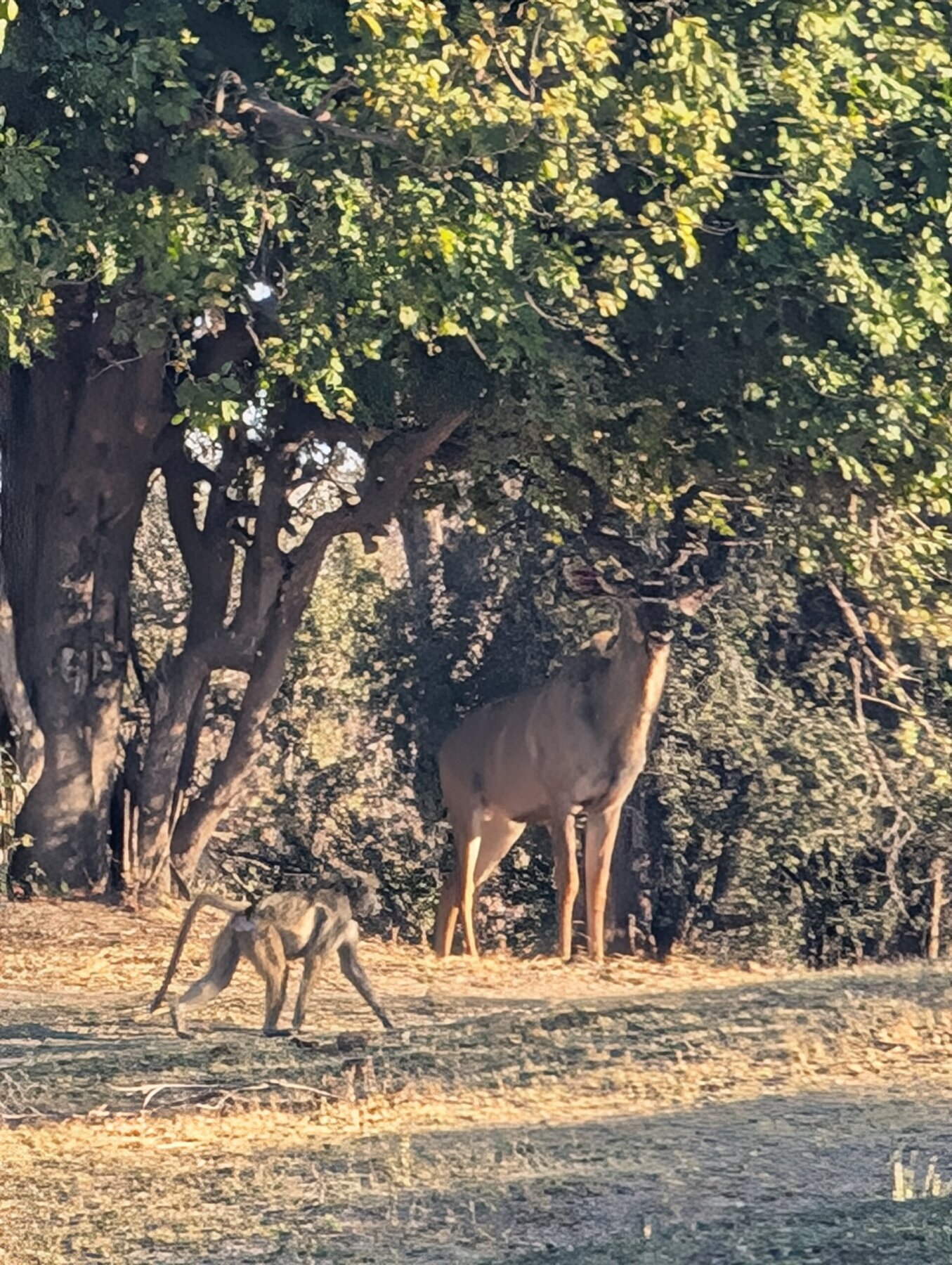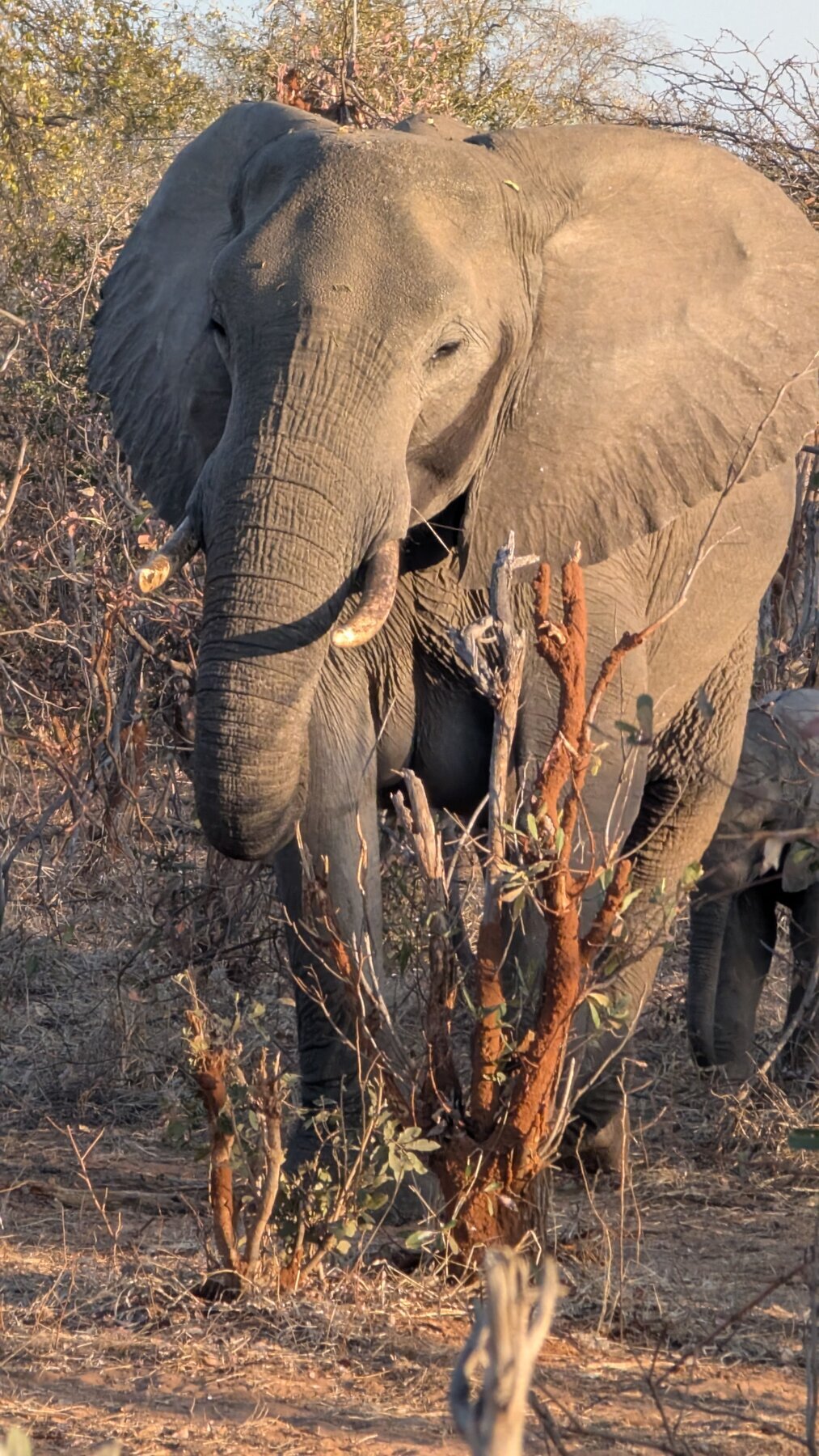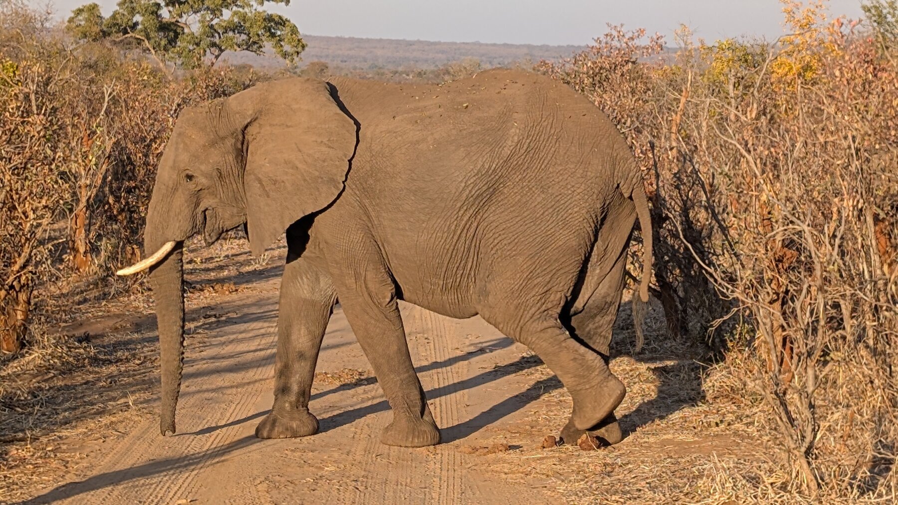 Day 2 our priority was Victoria Falls, which the guides recommended visiting in the afternoon. That left the morning for our first game drive. We had low expectations — the Old Drift’s surroundings are dry and dusty compared to the Okavango — but the lodge sits inside Zambezi National Park, and we saw elephants, giraffes, baboons, and cape buffalo in that one morning.
