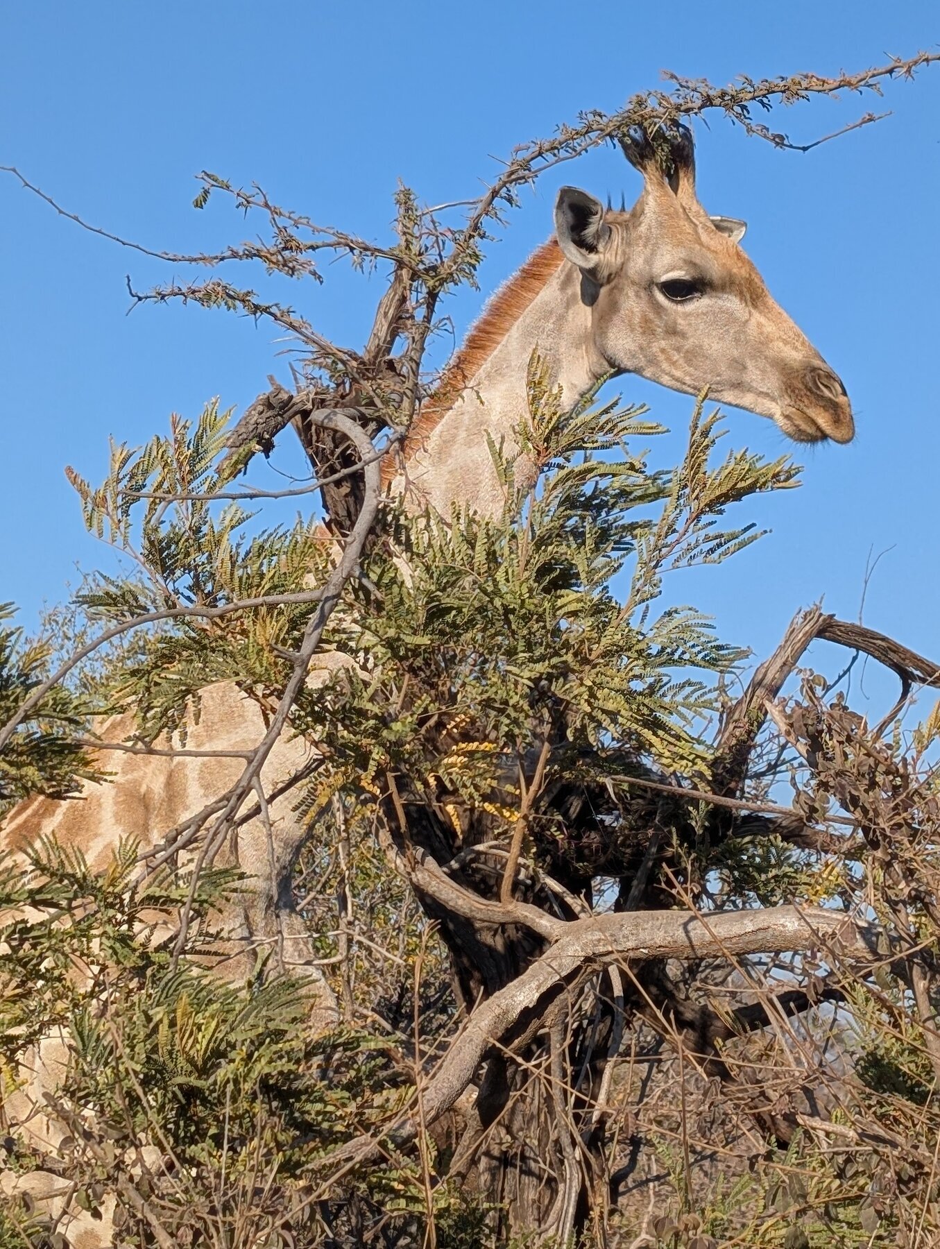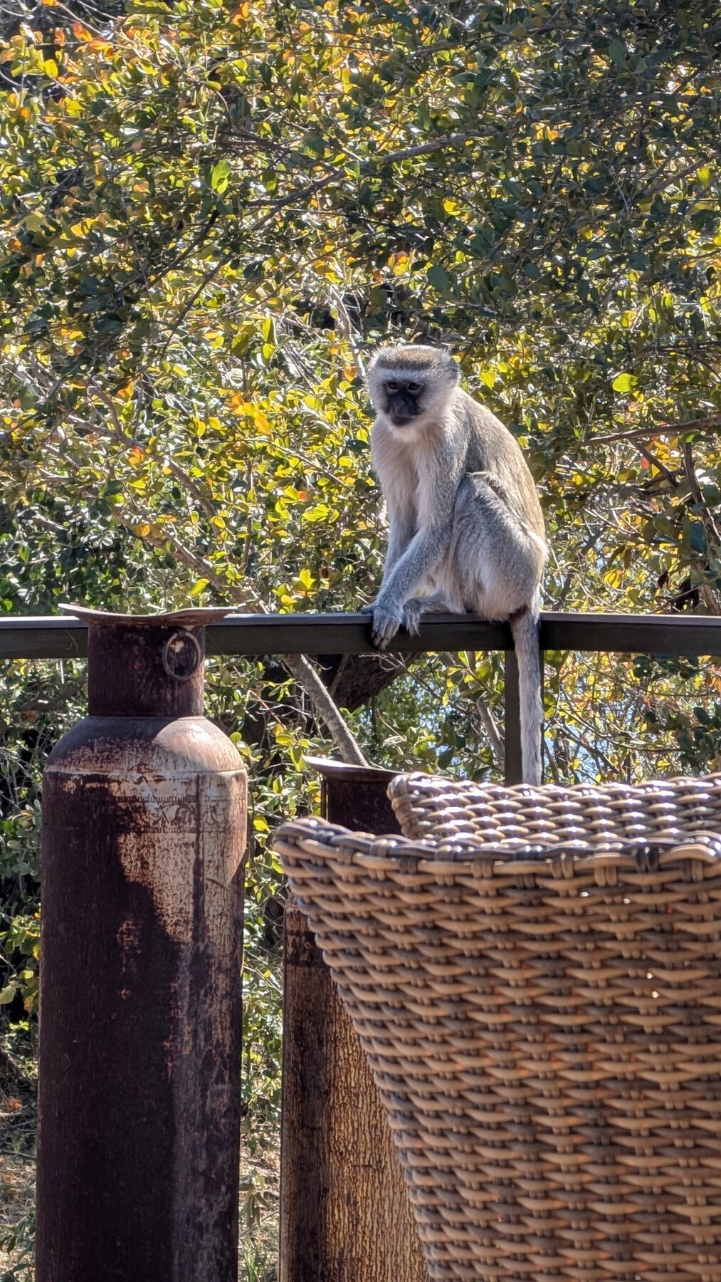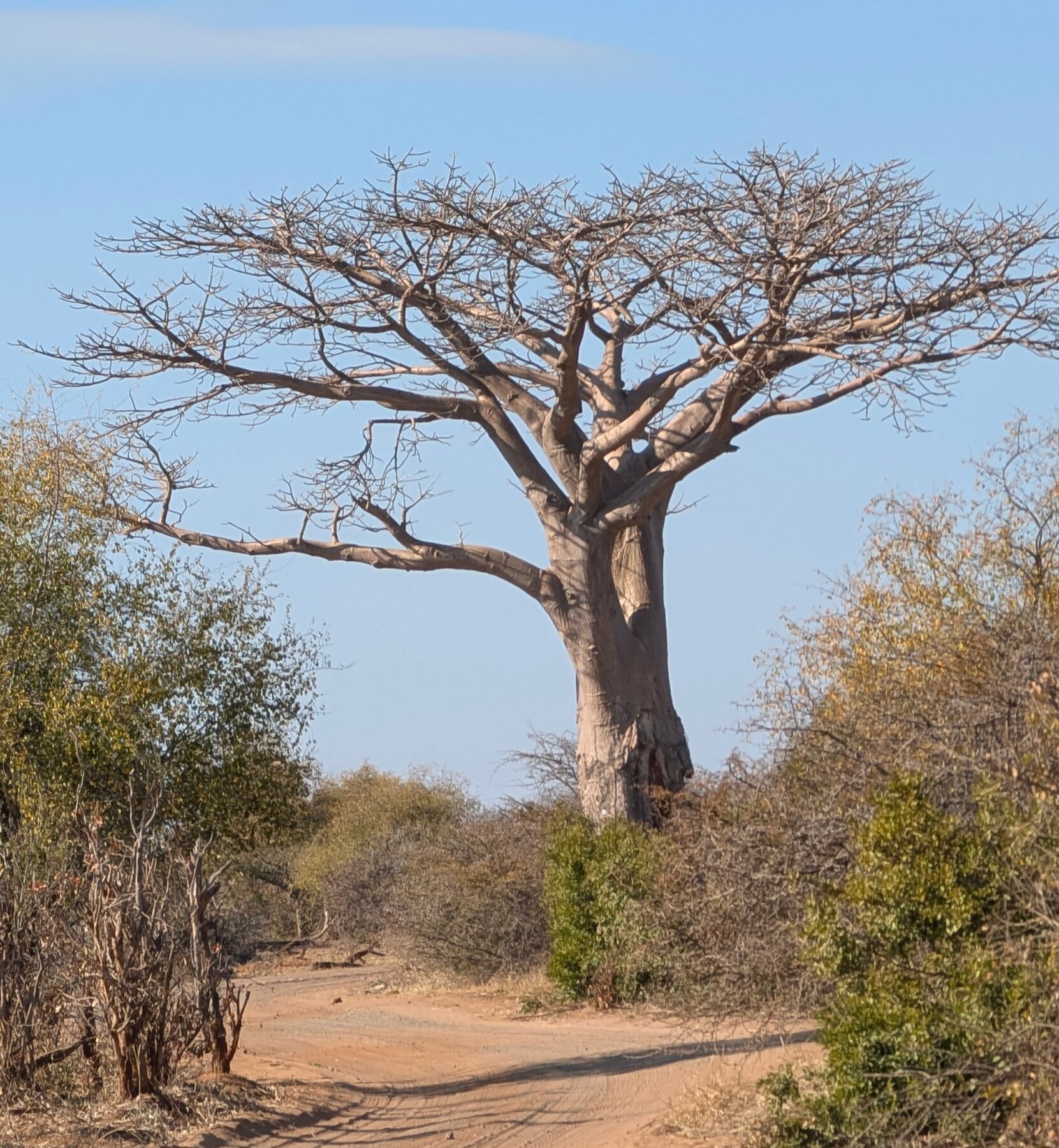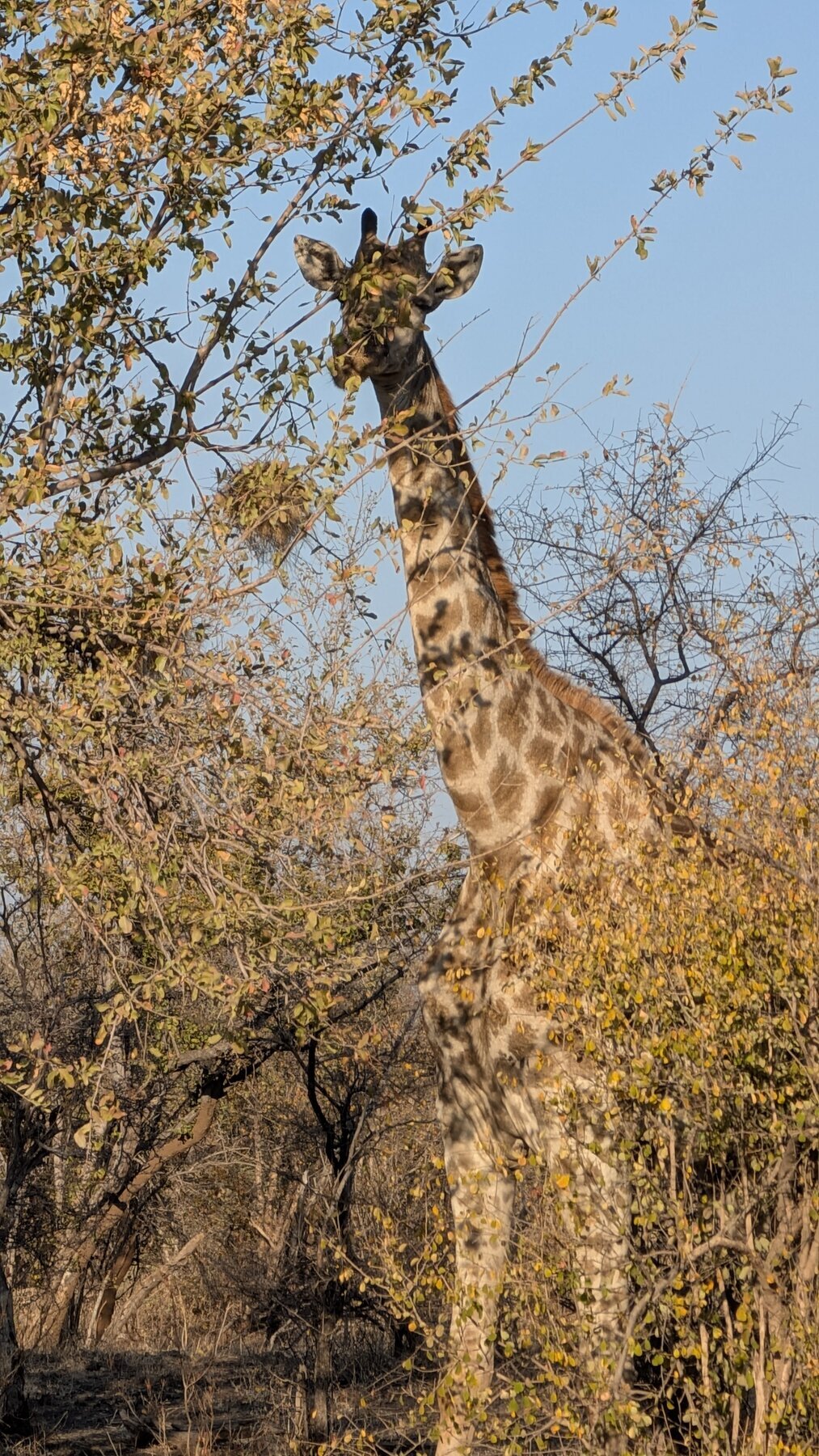 Day 2 our priority was Victoria Falls, which the guides recommended visiting in the afternoon. That left the morning for our first game drive. We had low expectations — the Old Drift’s surroundings are dry and dusty compared to the Okavango — but the lodge sits inside Zambezi National Park, and we saw elephants, giraffes, baboons, and cape buffalo in that one morning.