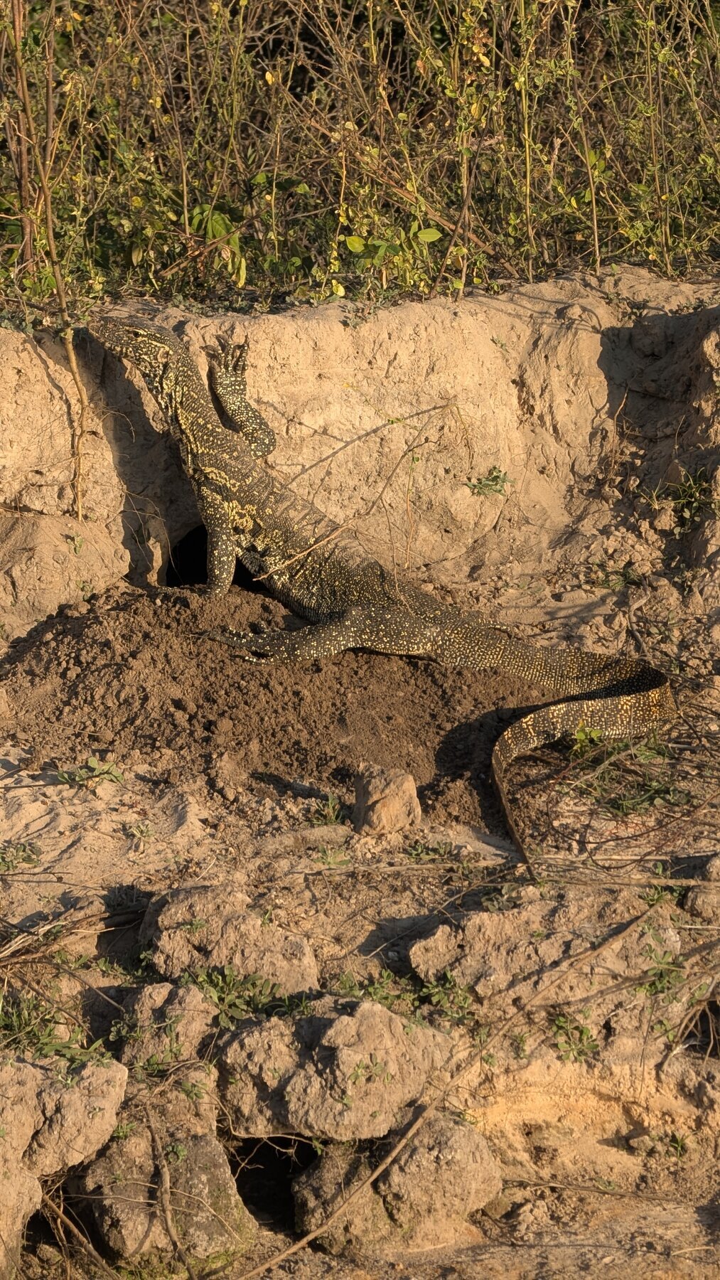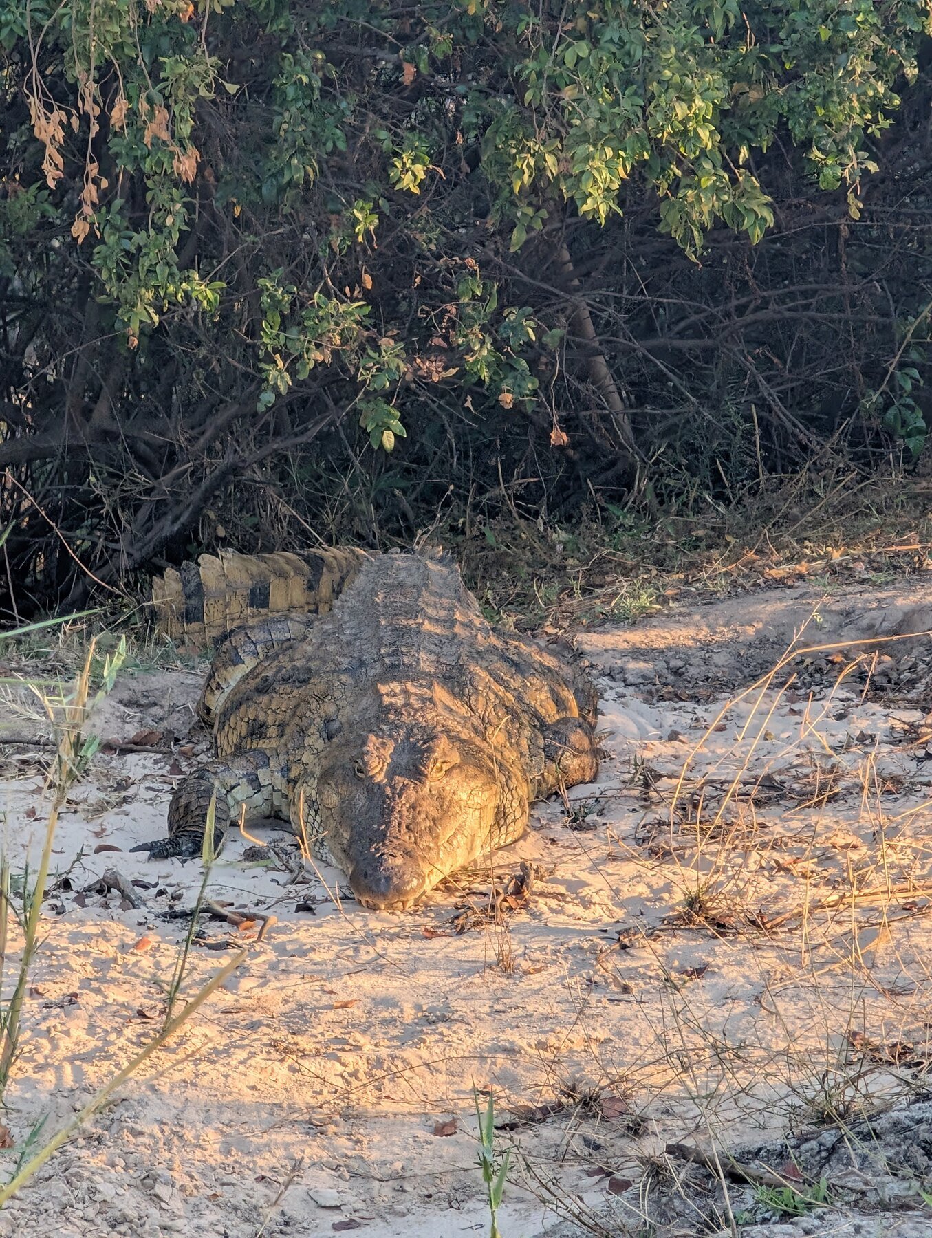 We unpacked and then had a 2–3 hour boat safari on the Zambezi — seeing kudu, elephants, a monitor lizard digging a nest, crocodiles, a baby hippo with its parents. Our guide/captain knew a great spot on the river to anchor for sunset. Lovely end to our first day “in the bush”.