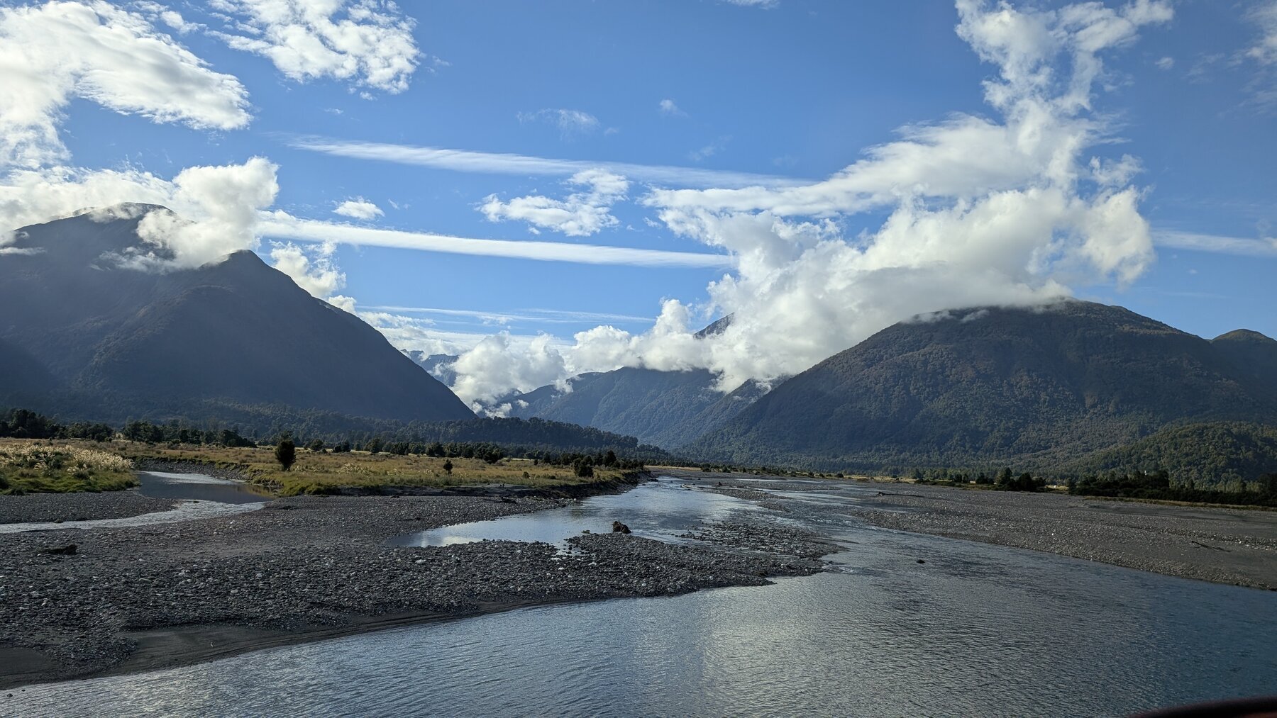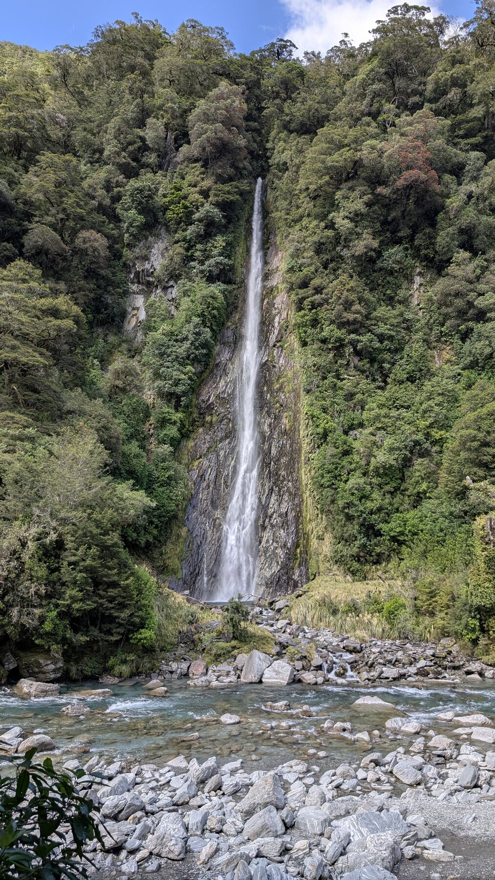 Crossing over from the west coast inland, the road passes along the Haast river, passing multiple lovely waterfalls. Thunder Creek Falls was a short walk from the highway.