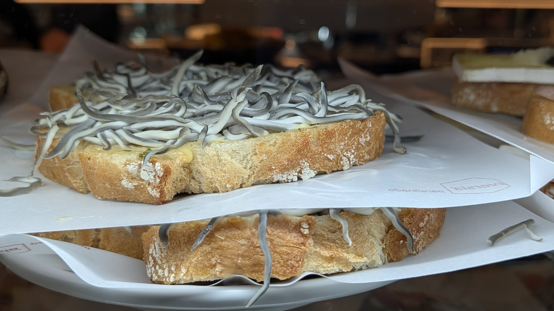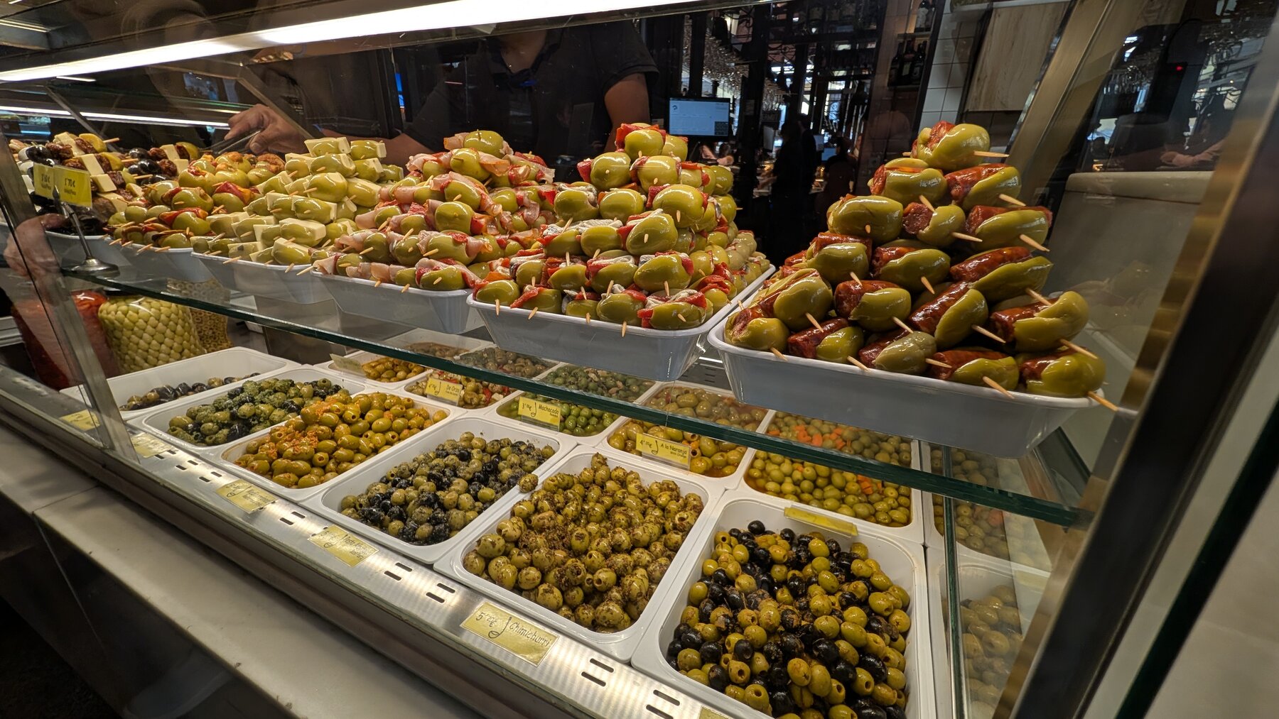 Inside, it’s a food hall built for grazing — small plates, wine by the glass, standing-room at high tables, everyone eating with one hand. We started with a vermouth on tap, tried a flight of Manchego from young to sharp, and kept moving. Not cheap, but the quality held up.